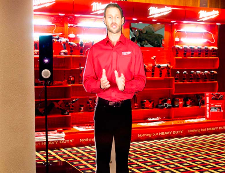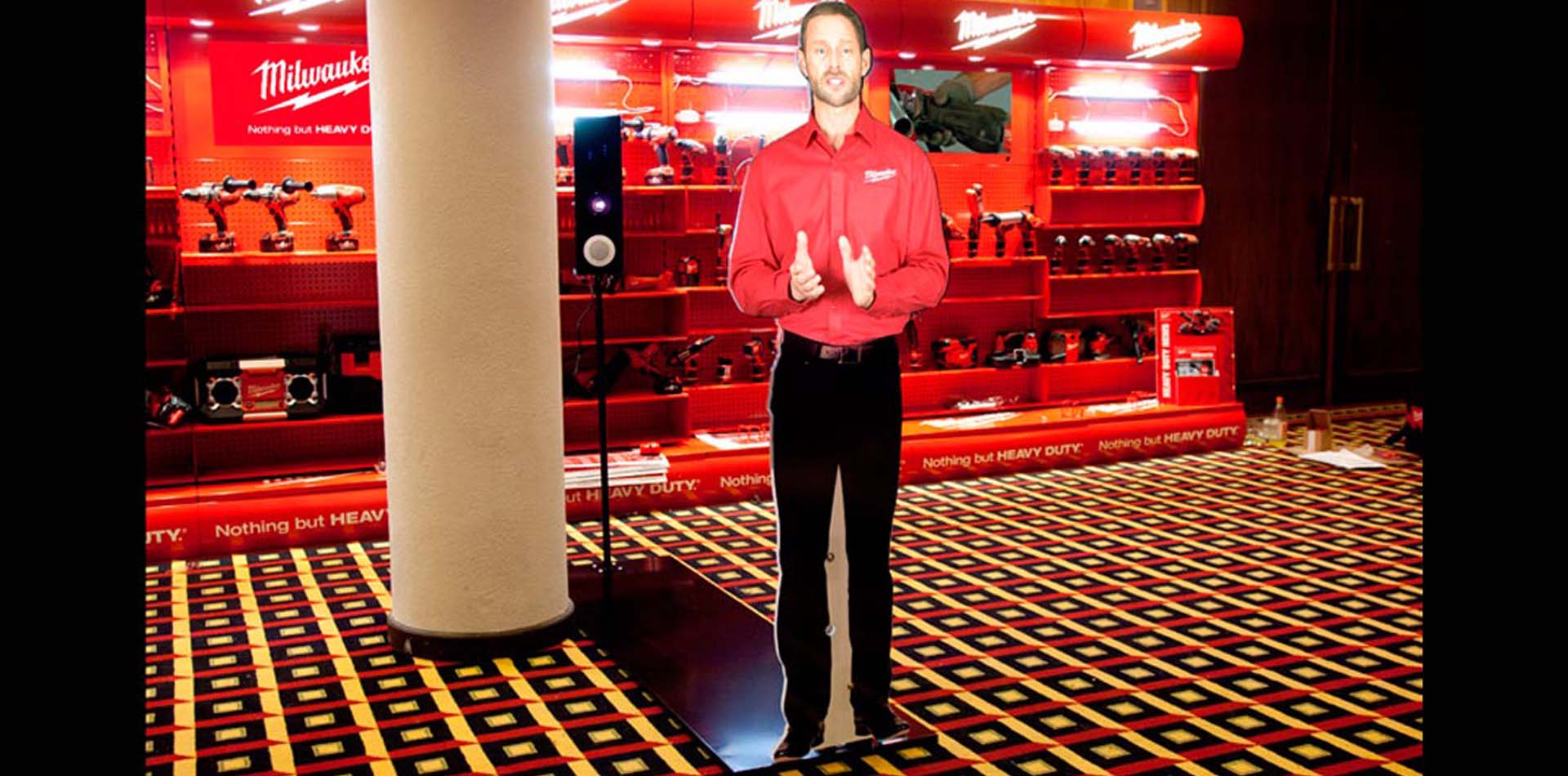 The Brief: Design a Mini (desktop) and Life Size (floor standing) Virtual mannequin for the launch of Milwaukees new battery technology. The mannequins were designed and software developed to interact with customers when they walk by the mannequins.